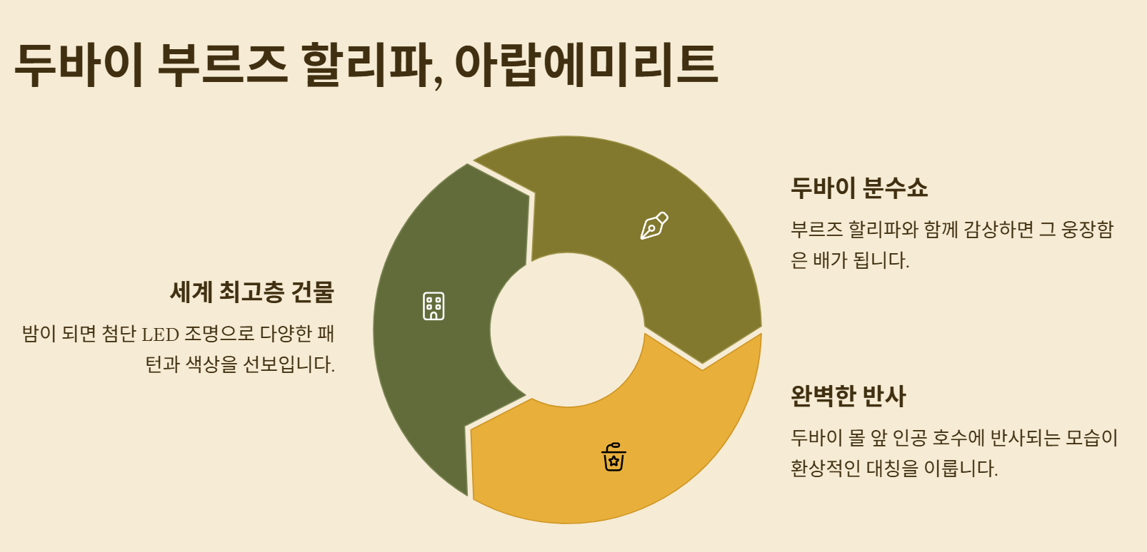 세계에서 가장 높은 건물인 부르즈 할리파는 밤이 되면 첨단 LED 조명으로 다양한 패턴과 색상을 선보이며 두바이의 밤하늘을 화려하게 수놓아요. 특히 두바이 분수쇼와 함께 감상하면 그 웅장함은 배가 된답니다.
