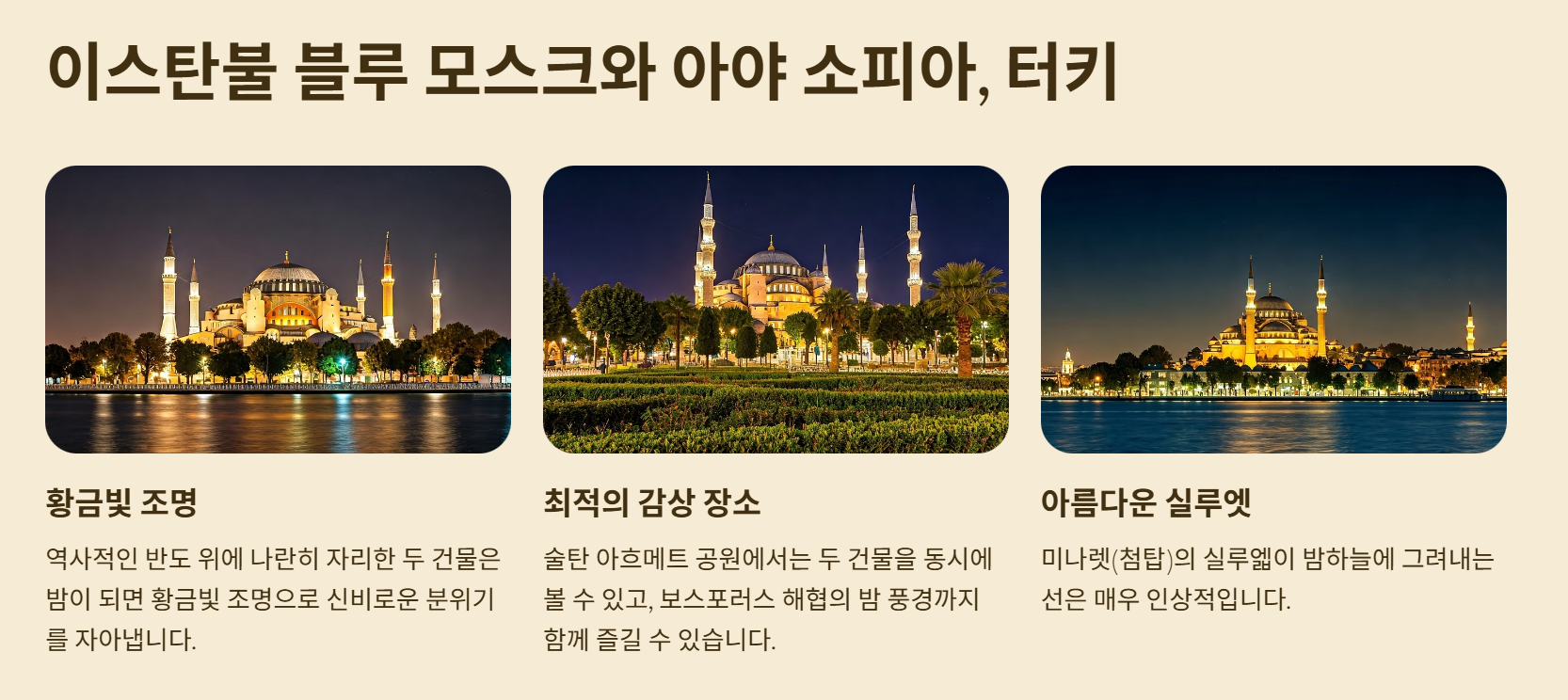 이스탄불의 역사적인 반도 위에 나란히 자리한 블루 모스크와 아야 소피아는 밤이 되면 황금빛 조명으로 더욱 신비로운 분위기를 자아내요. 동서양의 문화가 만나는 이스탄불의 야경은 마치 천일야화의 한 장면 같답니다.
