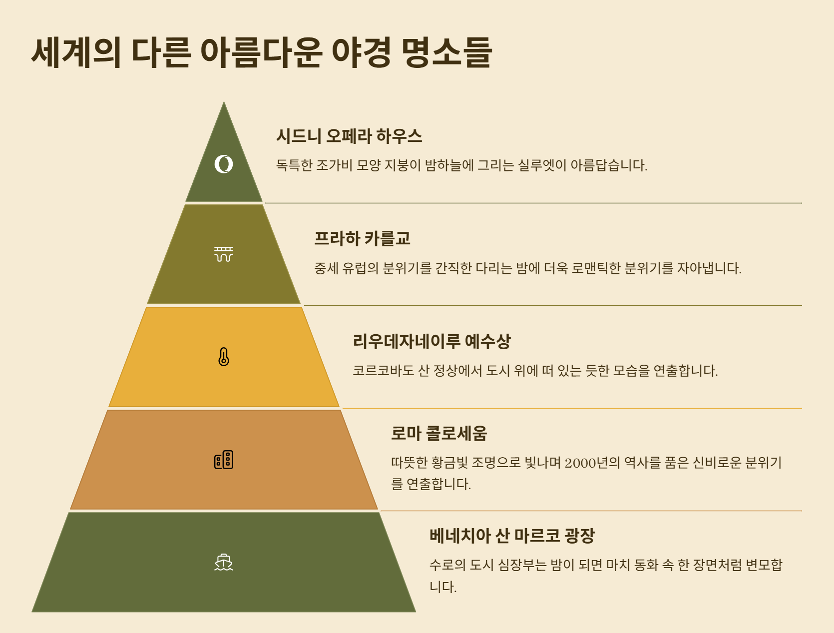 세계 곳곳의 아름다운 랜드마크들은 밤이 되면 또 다른 매력으로 여행자들을 매혹시켜요. 낮에 보는 것과는 전혀 다른 분위기를 자아내는 야경은 여행의 깊이를 더해주는 특별한 경험이 될 거예요.