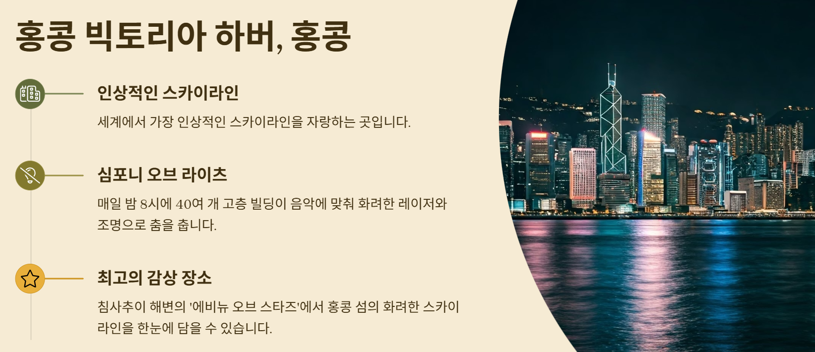 홍콩의 빅토리아 하버는 세계에서 가장 인상적인 스카이라인을 자랑하는 곳이에요. 매일 밤 8시에 펼쳐지는 '심포니 오브 라이츠' 쇼는 홍콩의 고층 빌딩 40여 개가 음악에 맞춰 화려한 레이저와 조명으로 춤을 추는 듯한 장관을 연출하죠.