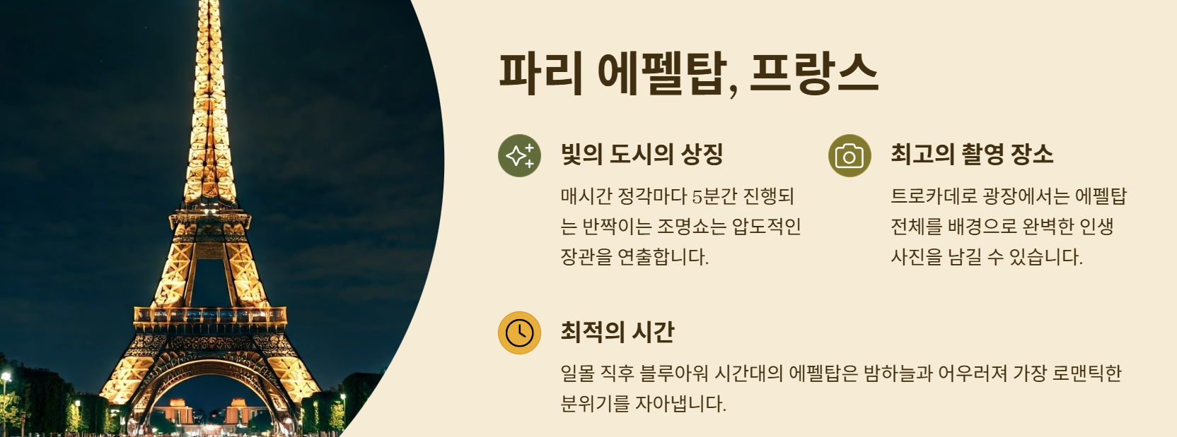 "빛의 도시" 파리의 상징인 에펠탑은 세계에서 가장 아름다운 야경을 자랑하는 랜드마크 중 하나예요. 매시간 정각마다 5분간 진행되는 반짝이는 조명쇼는 정말 압도적인 장관을 연출하죠.