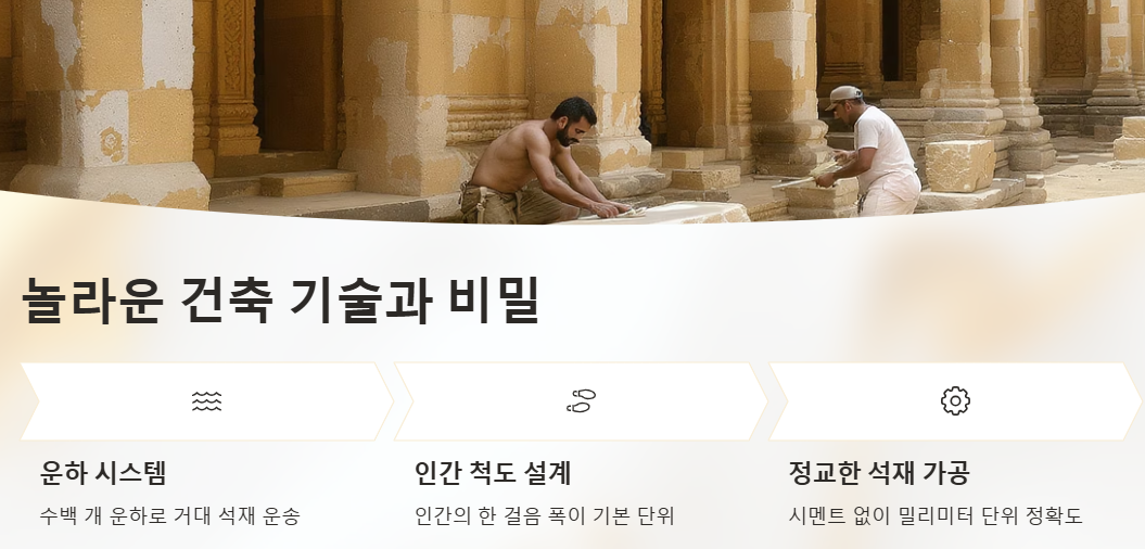 A: 인간의 한 걸음 폭을 기본 단위로 사용했어요. 그리고 힌두교의 우주관에 따라 미물계, 인간계, 천상계를 나타내는 3층 구조로 설계되었답니다. 종교적 의미와 실용성을 완벽하게 조화시킨 거죠.