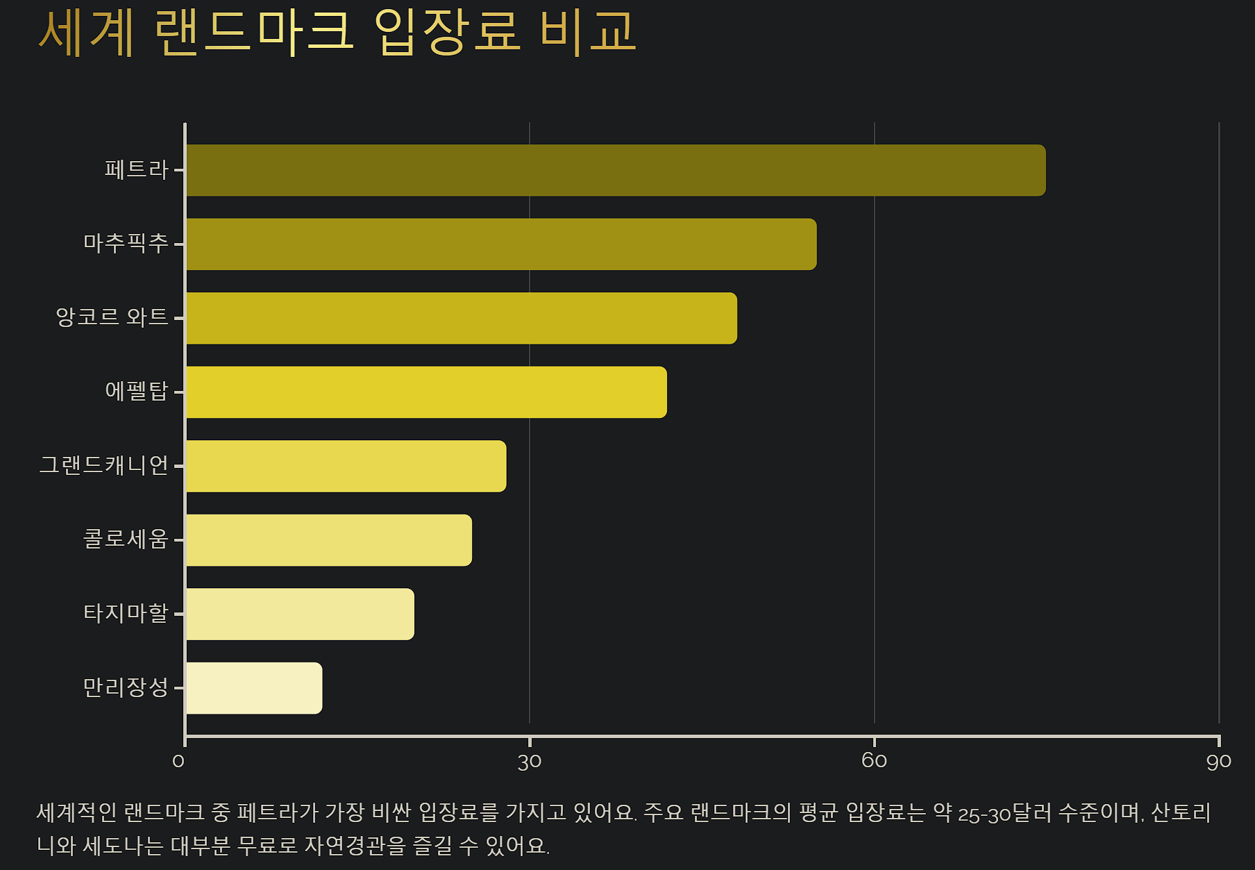 다음은 세계 유명 랜드마크의 입장료와 현지에서 보통 소요되는 시간, 그리고 최적의 방문 시기를 정리한 표예요.