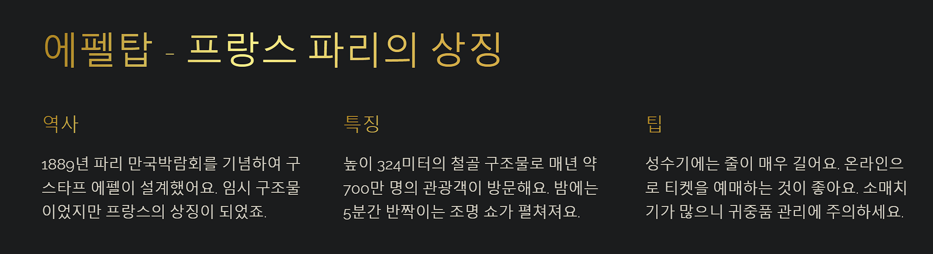 에펠탑에는 총 3개의 층이 있는데, 각 층마다 다른 매력이 있어요. 1층과 2층에는 레스토랑이 있어 파리의 전경을 감상하며 식사를 즐길 수 있고, 꼭대기 층에서는 파노라마 뷰로 파리 전체를 한눈에 담을 수 있어요.