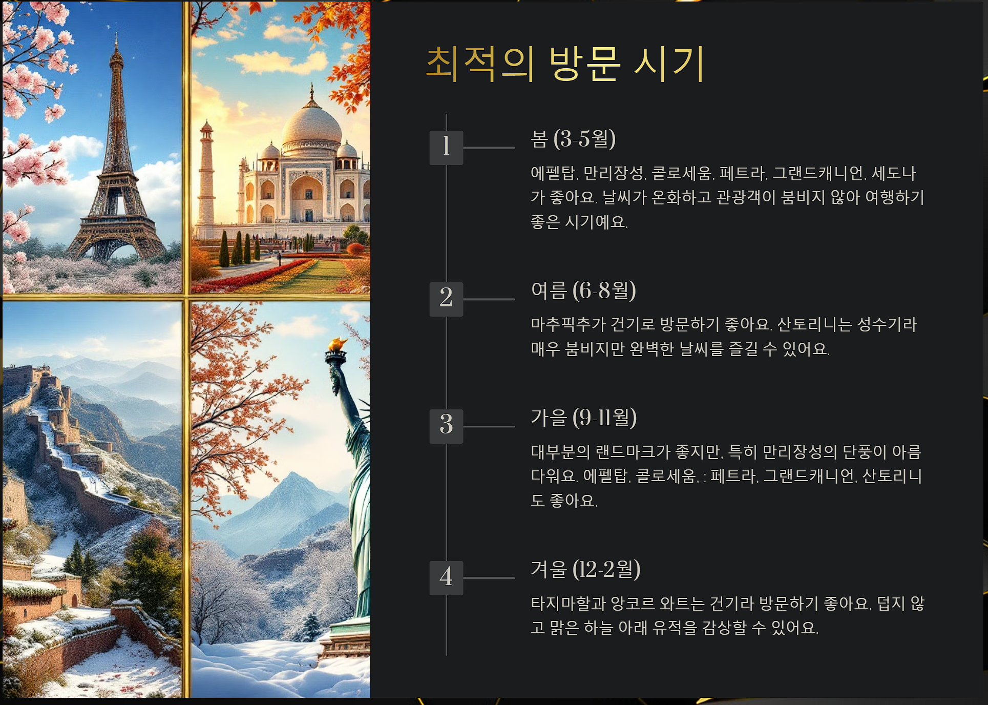 대부분의 랜드마크는 봄(4-5월)과 가을(9-10월)이 날씨도 좋고 관광객도 상대적으로 적어 방문하기 좋아요. 하지만 타지마할과 앙코르 와트 같은 열대 지역은 건기인 11월부터 2월이 더 쾌적하답니다.