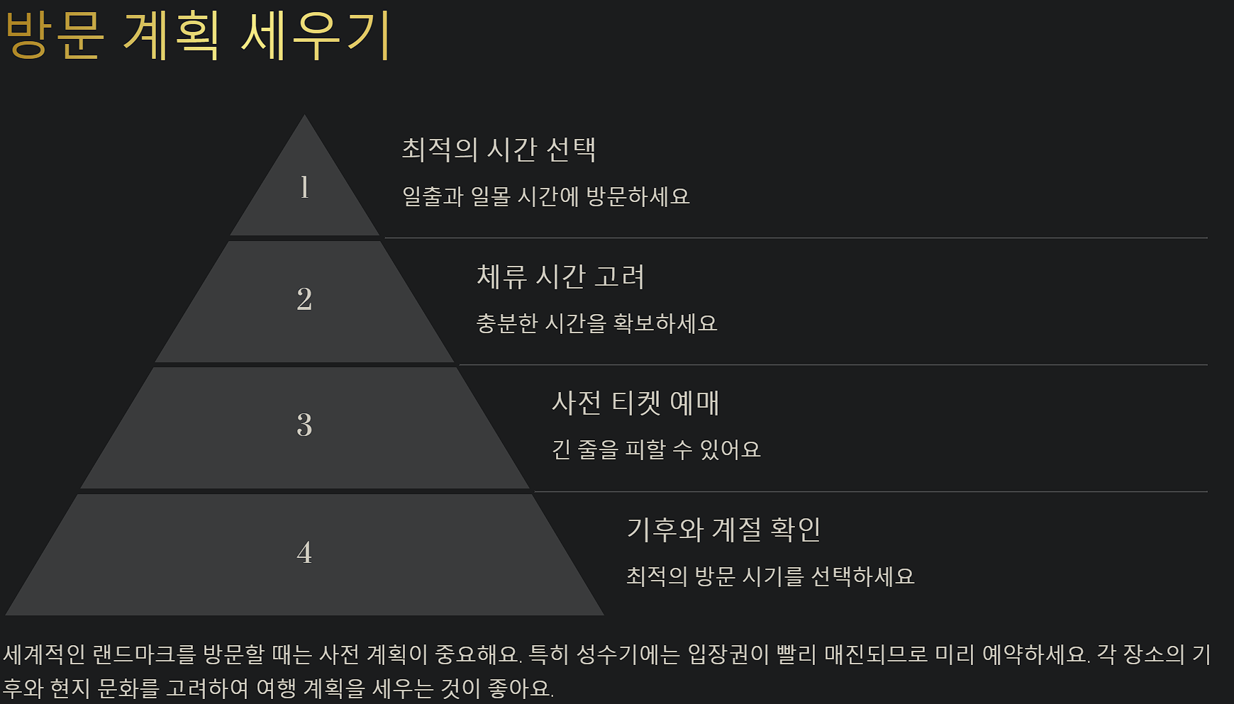 세계의 유명 랜드마크를 방문할 때는 철저한 사전 준비가 필요해요. 입장권은 가능한 한 미리 온라인으로 예약하고, 각 지역의 기후에 맞는 옷차림을 준비하세요. 또한 현지 문화와 관습을 존중하는 태도는 여행의 질을 높이는 중요한 요소랍니다.