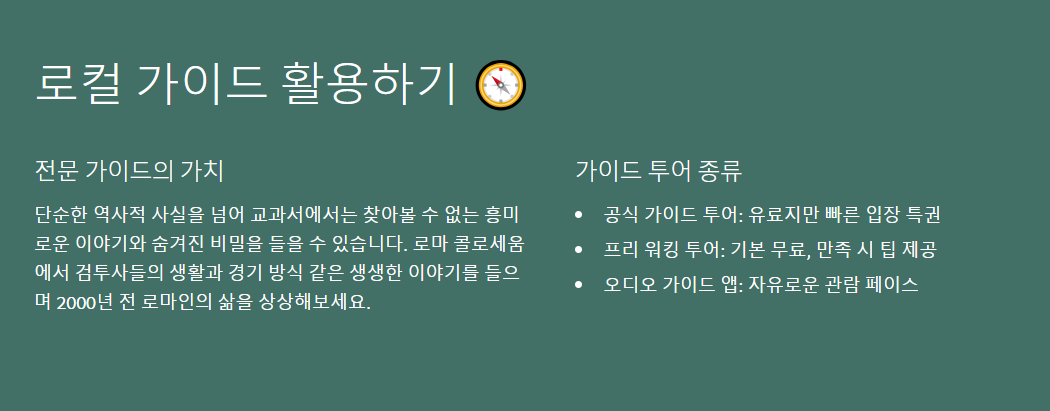 예를 들어, 로마의 콜로세움을 혼자 둘러보면 그저 거대한 고대 건축물로만 보일 수 있지만, 전문 가이드와 함께라면 검투사들의 생활, 경기 방식, 관중의 반응 등 생생한 이야기를 들으며 2000년 전 로마인의 삶을 상상해볼 수 있어요.