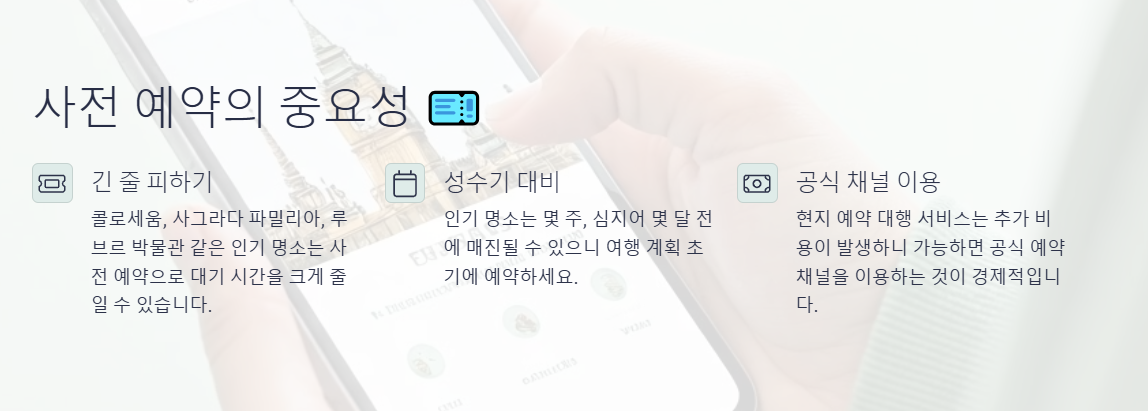 로마의 콜로세움, 바르셀로나의 사그라다 파밀리아, 파리의 루브르 박물관 같은 인기 랜드마크는 방문 당일에 티켓을 구매하려면 몇 시간씩 줄을 서야 할 수도 있어요. 그러나 사전에 인터넷으로 예약하면 빠른 입장이 가능한 경우가 많답니다.