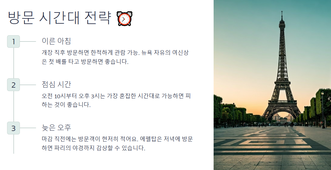 많은 유명 랜드마크들은 개장 직후나 마감 직전에 방문객이 현저히 적어요. 예를 들어 뉴욕의 자유의 여신상은 아침 첫 배를 타고 방문하면 한적하게 관람할 수 있어요. 또 파리의 에펠탑은 저녁 늦게 방문하면 낮보다 대기 시간이 짧고, 밤에 빛나는 파리의 경관까지 감상할 수 있는 보너스가 있죠!